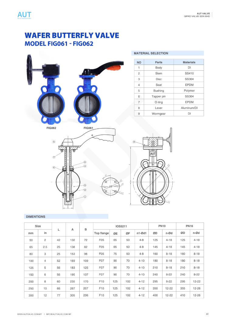 - Vật liệu chế tạo: Gang dẻo. Đĩa van bằng Inox SS304, Trục van bằng Inox SS304 Gioăng làm kín cao su EPDM.