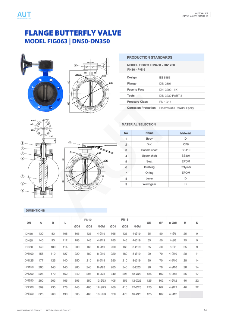 - Vật liệu chế tạo: Thân van bằng gang GGG50, Trục và đĩa van bằng inox CF8. Hộp số bằng gang.